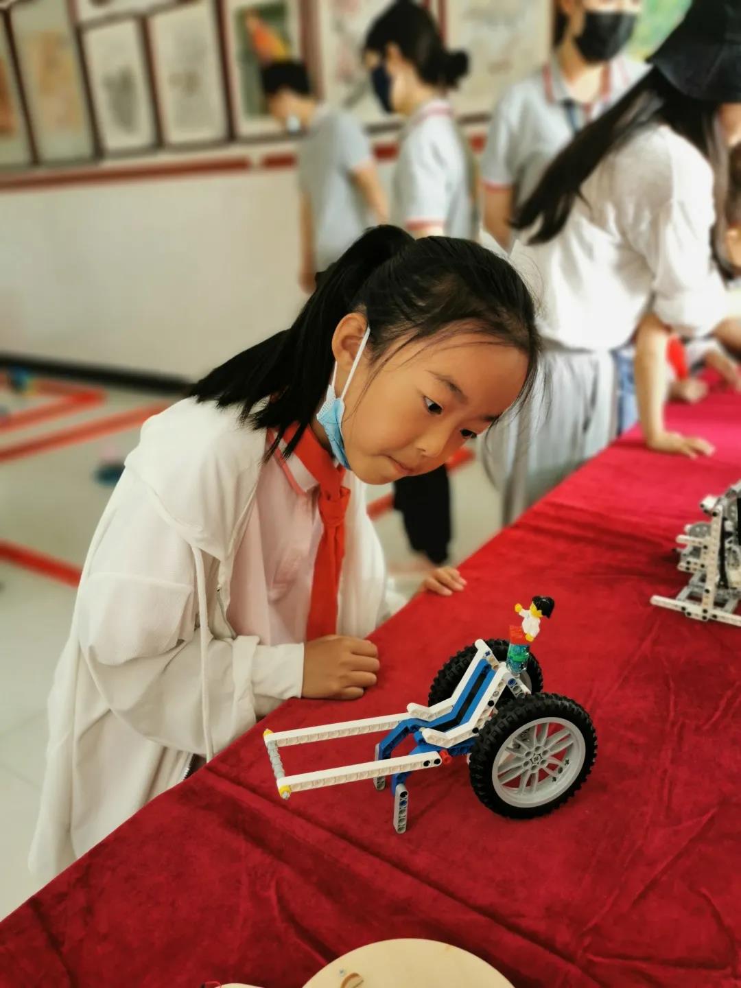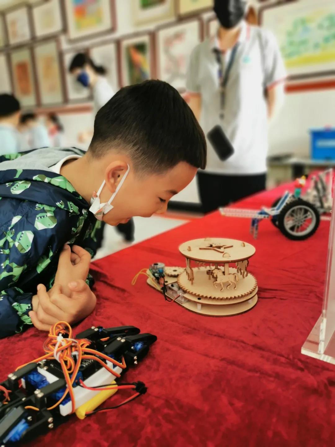 老師們帶來了利用傳感器制作的各種智能體感游戲和用電子芯片控制的科技作品,這些作品都是蝸牛漫步的小學員們利用激光切割機、小車床等工具制作完成,并通過編程軟件控制其中的電子芯片,使其發聲、發光或者進行軌跡運動。還有用積木零件搭建完成的各種小車,利用程序控制小車完成前進、后退、左右轉彎、撿球、投球等功能。