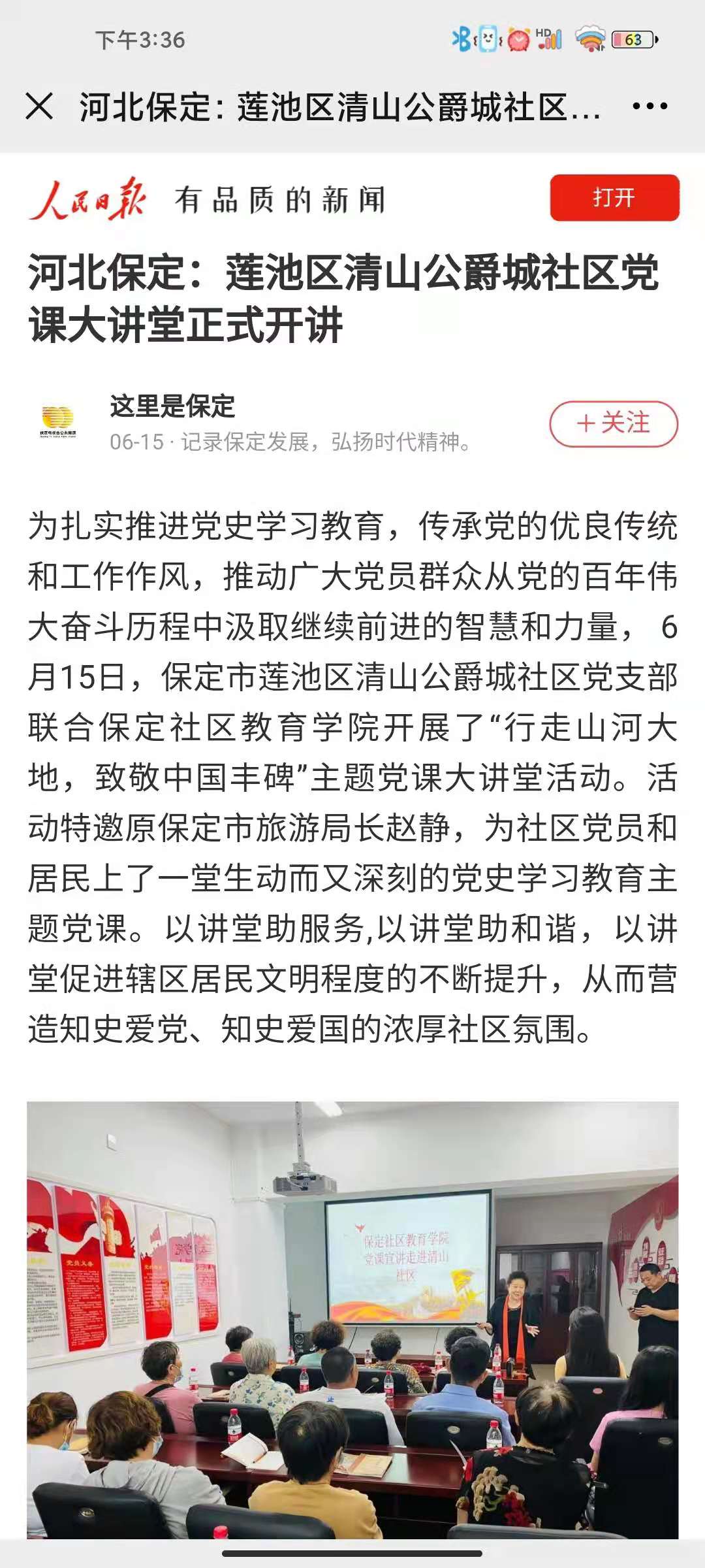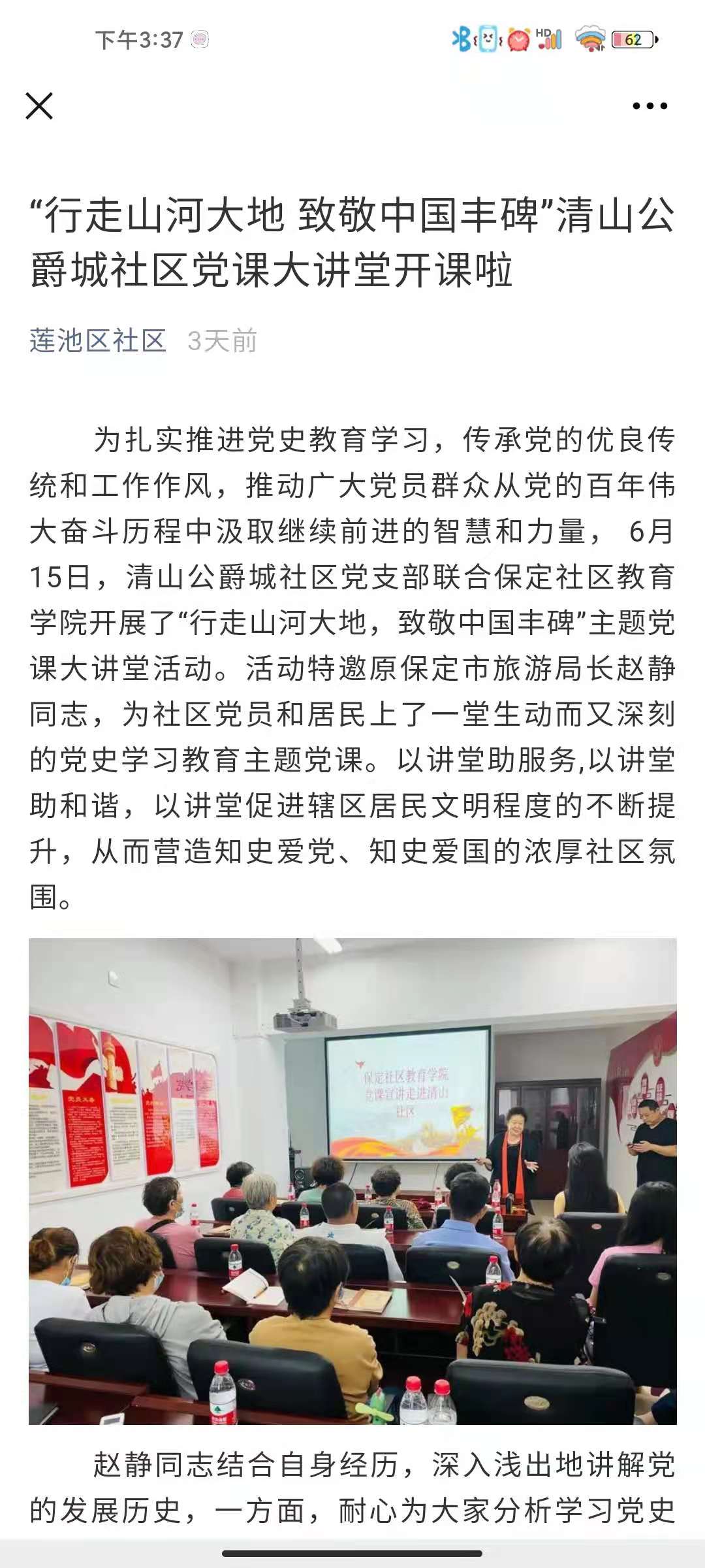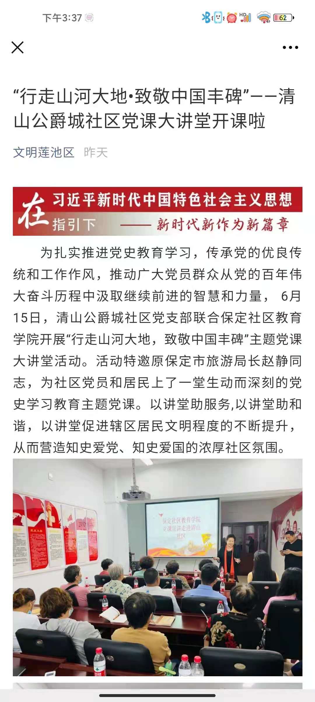 為扎實推進黨史學習教育,傳承黨的優良傳統和工作作風,推動廣大黨員群眾從黨的百年偉大奮斗歷程中汲取繼續前進的智慧和力量, 6月15日,保定市蓮池區清山公爵城社區黨支部聯合保定社區教育學院開展了“行走山河大地,致敬中國豐碑”主題黨課大講堂活動。活動特邀原保定市旅游局長趙靜,為社區黨員和居民上了一堂生動而又深刻的黨史學習教育主題黨課。以講堂助服務,以講堂助和諧,以講堂促進轄區居民文明程度的不斷提升,從而營造知史愛黨、知史愛國的濃厚社區氛圍。