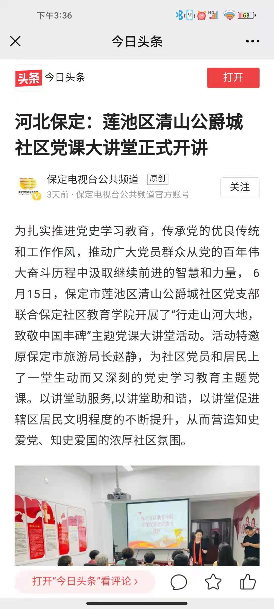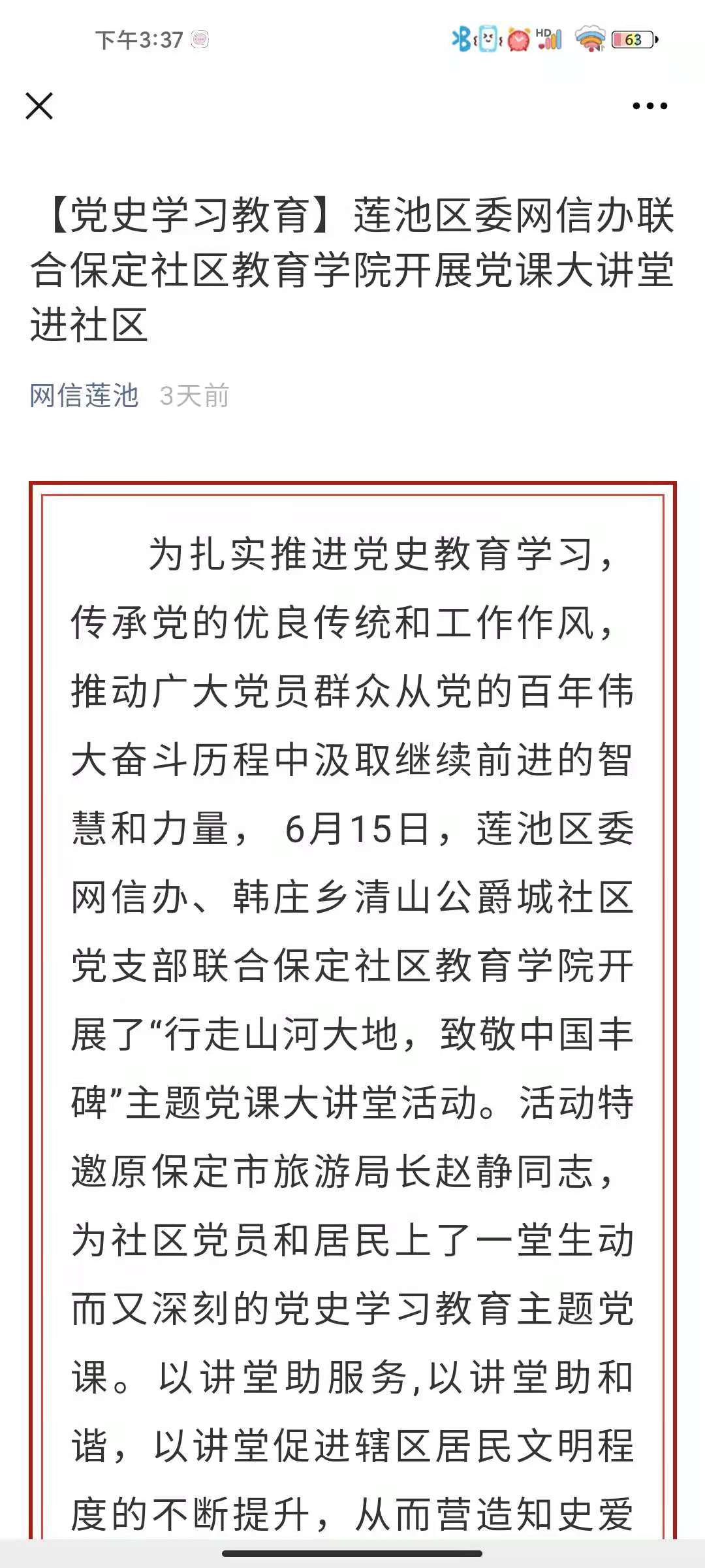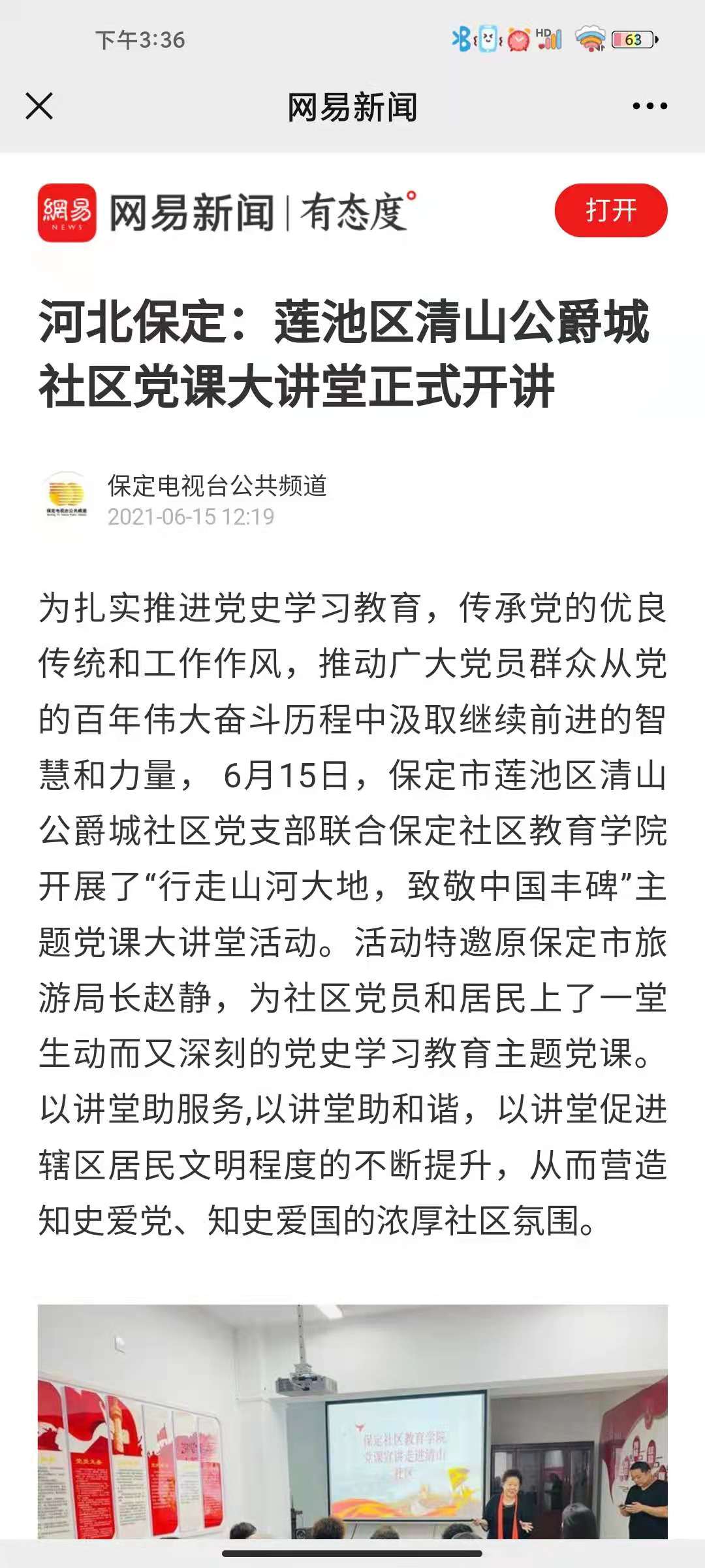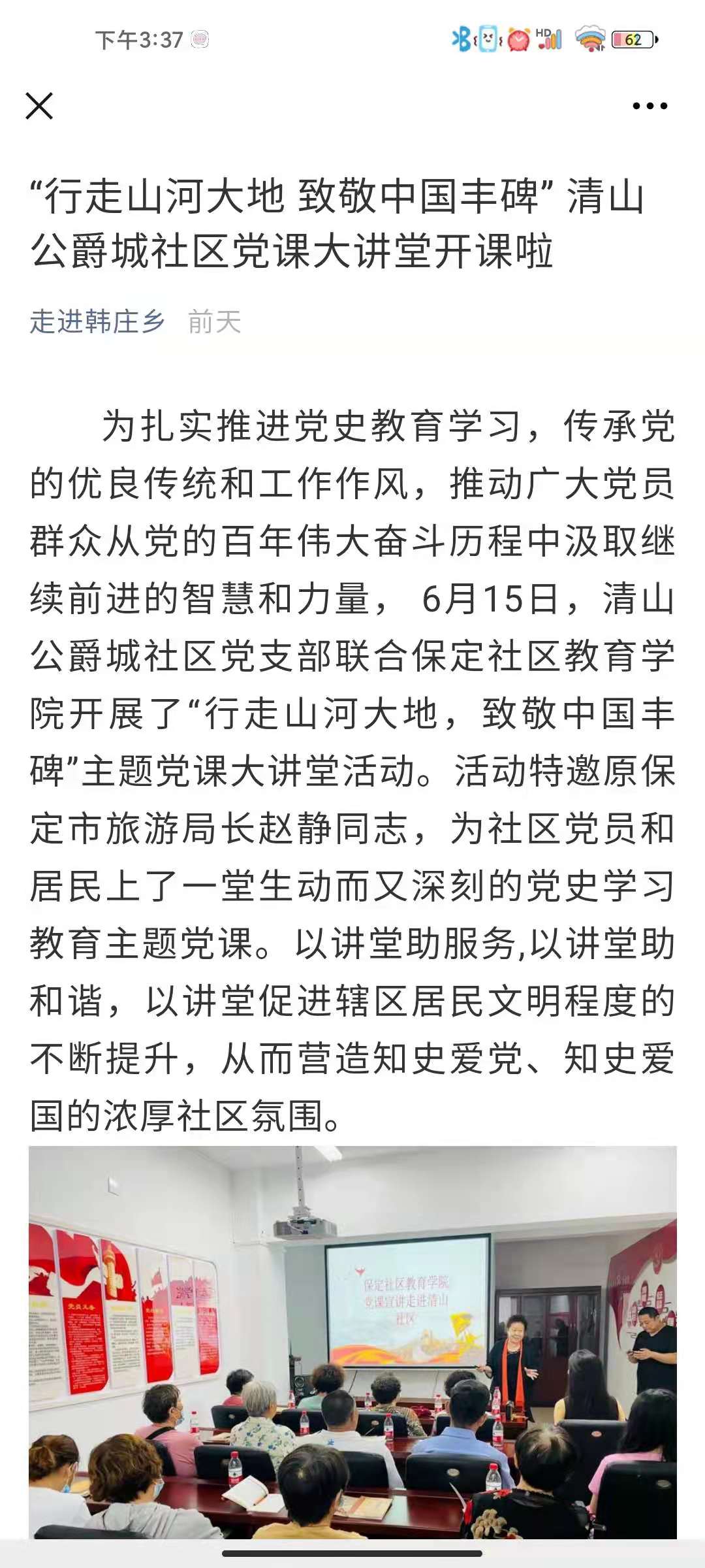 為扎實推進黨史學習教育,傳承黨的優良傳統和工作作風,推動廣大黨員群眾從黨的百年偉大奮斗歷程中汲取繼續前進的智慧和力量, 6月15日,保定市蓮池區清山公爵城社區黨支部聯合保定社區教育學院開展了“行走山河大地,致敬中國豐碑”主題黨課大講堂活動。活動特邀原保定市旅游局長趙靜,為社區黨員和居民上了一堂生動而又深刻的黨史學習教育主題黨課。以講堂助服務,以講堂助和諧,以講堂促進轄區居民文明程度的不斷提升,從而營造知史愛黨、知史愛國的濃厚社區氛圍。