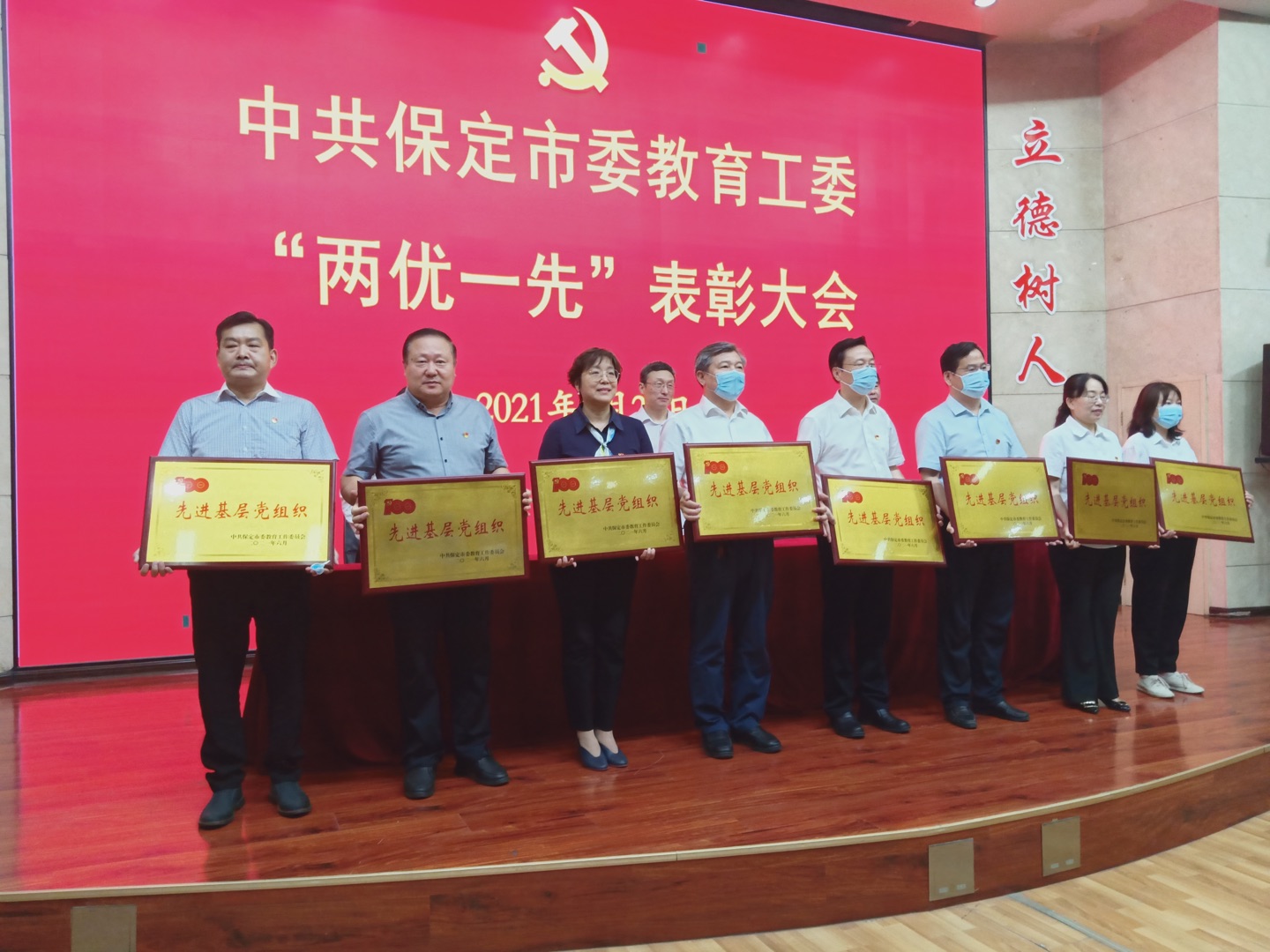 6月29日,在中共保定市委教育工委”兩優一先“表彰大會上,保定電大第四黨支部書記高昉同志作為先進基層黨組織代表上臺領獎