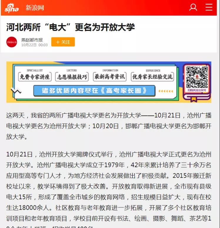日前,滄州開放大學(xué)舉行揭牌儀式,網(wǎng)易新聞、河北新聞網(wǎng)、《燕趙都市報》新媒體、長城網(wǎng)、《滄州日報》、《滄州晚報》、滄州電視臺、滄州電臺等媒體對揭牌更名和滄州廣播電視大學(xué)所做的歷史貢獻(xiàn)給予了報道。此后,《人民日報》、《瀟湘晨報》等報刊新媒體和騰訊網(wǎng)、新浪網(wǎng)、今日頭條、一點(diǎn)資訊、新浪微博等十余家媒體平臺對報道進(jìn)行轉(zhuǎn)載,進(jìn)一步提升了滄州開放大學(xué)的知名度和美譽(yù)度。