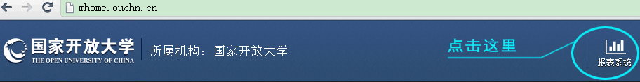 4.國開學習網報表系統(tǒng)已于2017年秋季學期正式上線使用。各級管理員登陸學習網管理空間后,可在屏幕右上方位置點擊“報表系統(tǒng)”進入。如下所示: